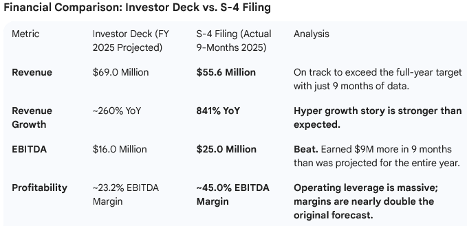The S-4 provides concrete evidence of Securitize’s rapid commercialization. The S-4 filing reveals results that have dramatically outperformed the projections shared in Securitize’s earlier investor presentation deck (the one that accompanied the initial public filing in late 2025, based on data through mid-2025).