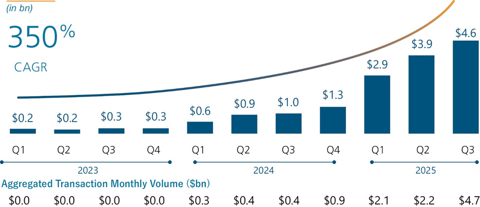 Monthly transaction volume (investments, redemptions, dividends, and cross-chain movements) soared from under $50 million to $4.7 billion by Q3 2025.